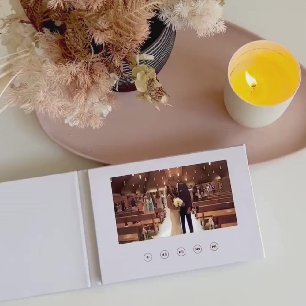 Med Videobok är dina bästa minnen alltid inom räckhåll. Öppna bara omslaget och din video börjar spelas upp direkt – automatiskt. Det perfekta sättet att återuppleva era speciella stunder tillsammans.
